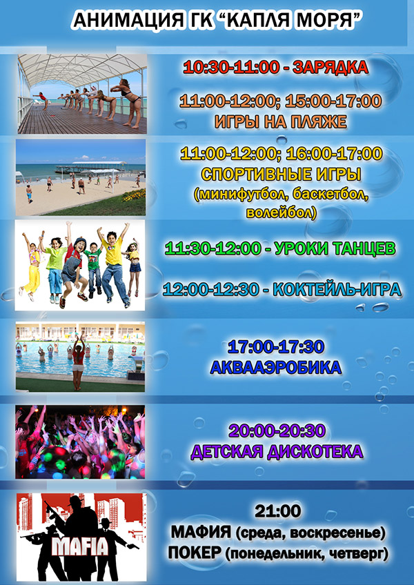 Наша команда анимации подготовила для Вас массу развлечений: спортивные игры (волейбол, баскетбол, футбол), турниры по настольному теннису, активные занятия аэробикой, современными танцами. Для Вас тематические вечеринки, мастер-классы, конкурсы и многое другое. Наших маленьких гостей мы порадуем открытием детской комнаты на пляже "Теремок", в котором будут проходить творческие занятия, детское караоке, мастер-классы для малышей, спортивные состязания и праздники.